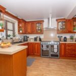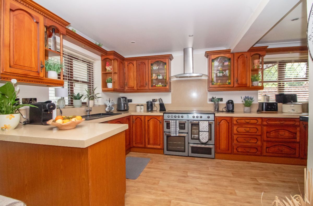 (Maximum measurements). Matching range of wall and base units complemented with polished stone work surfaces over incorporating 1½ bowl sink unit with mixer tap and drainer, integrated dishwasher, space for 'Range' style cooker (negotiable) with extractor canopy over, integrated fridge, space for table and chairs, coved and smoothed ceiling with pin spot downlighting, double glazed window to rear aspect, double glazed lead light effect window to side aspect, double glazed sliding patio doors to sun lounge.