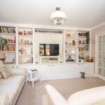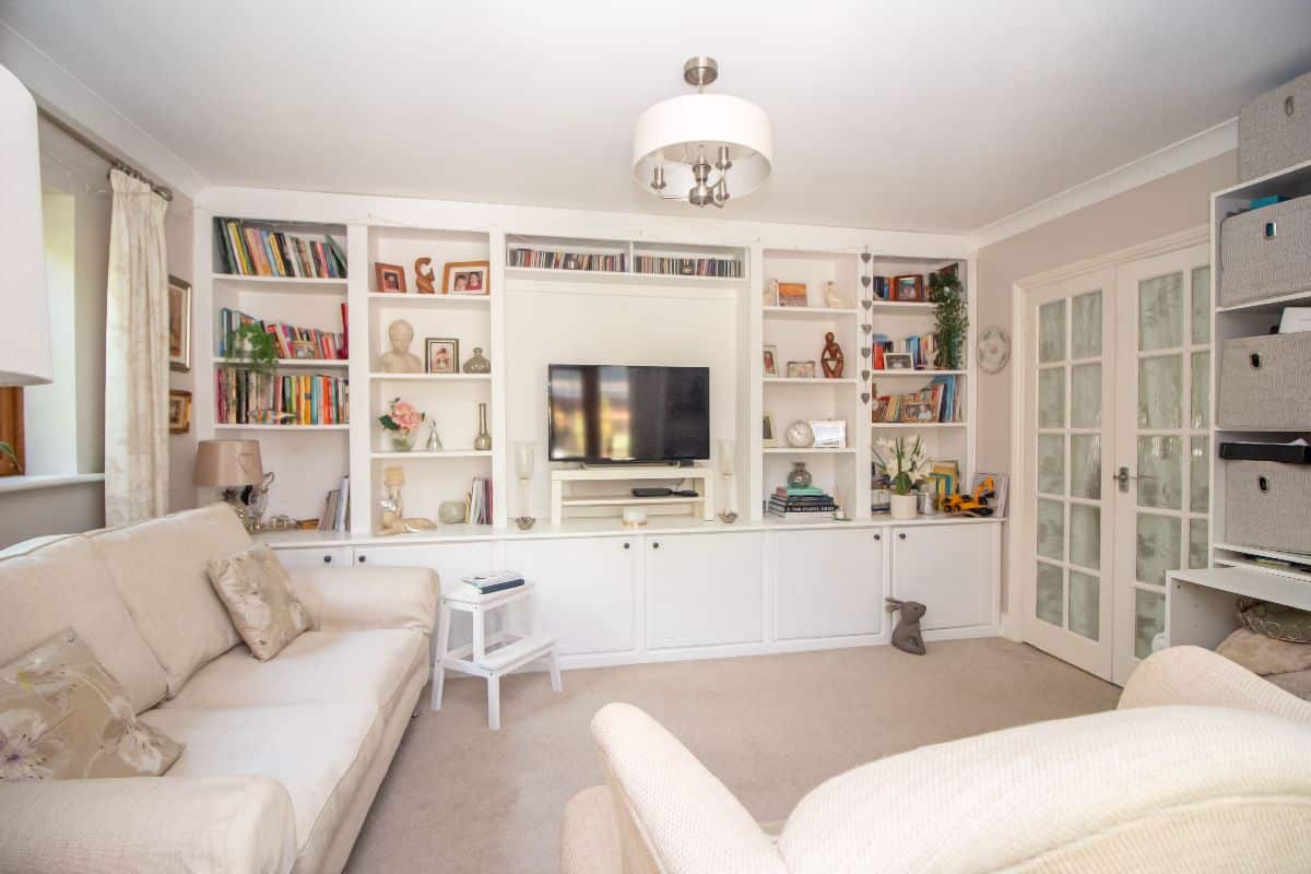 Double glazed lead light effect window to rear aspect, double glazed lead light effect double doors to side aspect and garden, double doors to lounge, feature wall with extensive fitted shelving and storage, radiator, coved and smoothed ceiling.