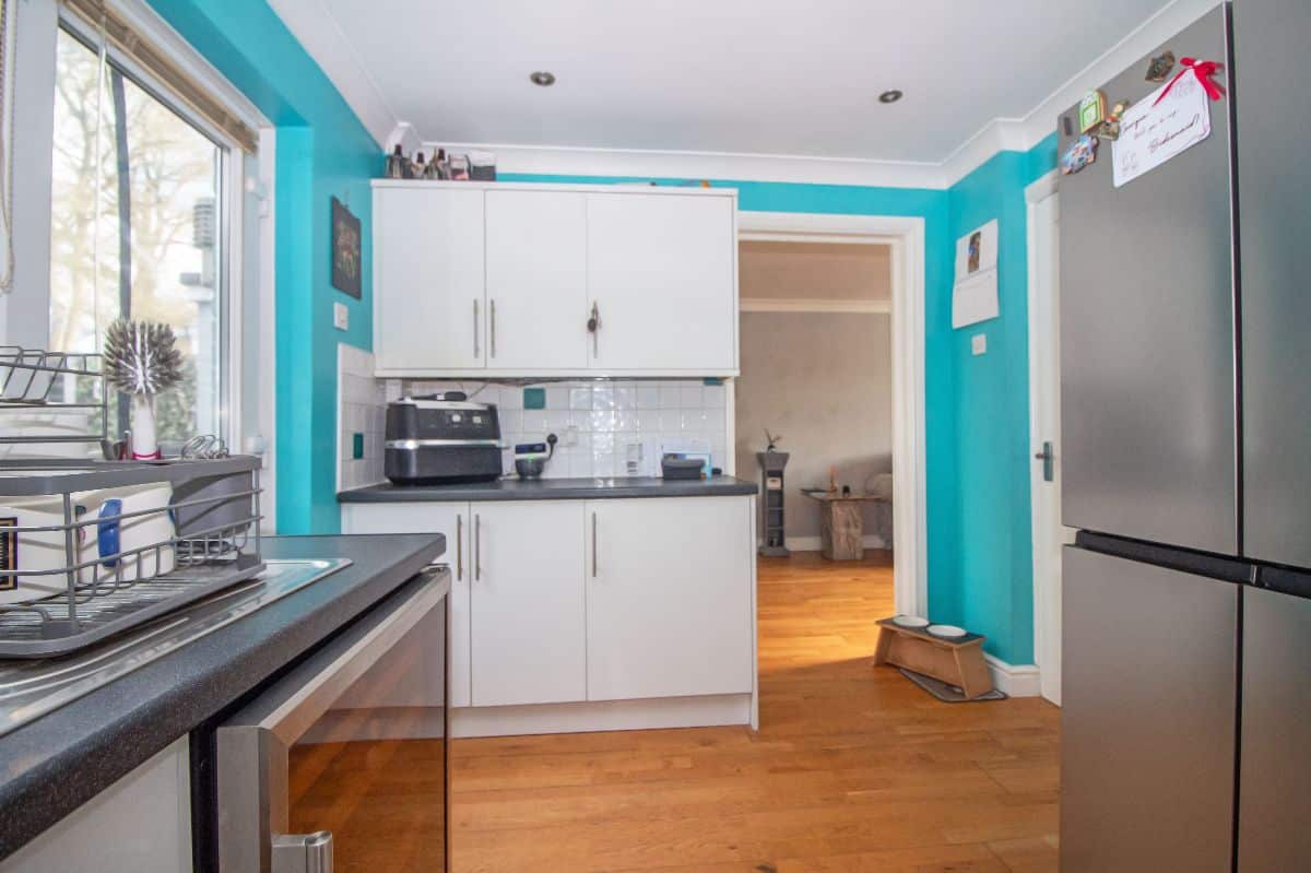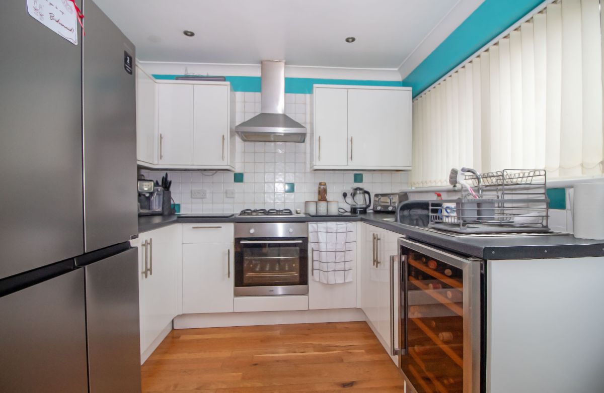 Modern matching range of wall and base units complemented with work surfaces over incorporating stainless steel sink unit with mixer tap and drainer, four ring gas hob with extractor canopy over and electric oven below, double glazed window to rear aspect, space for 'American' style fridge / freezer, double glazed window and door to rear aspect, wood flooring, coved and smoothed ceiling with pin spot downlighting.