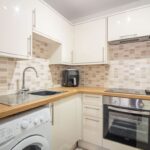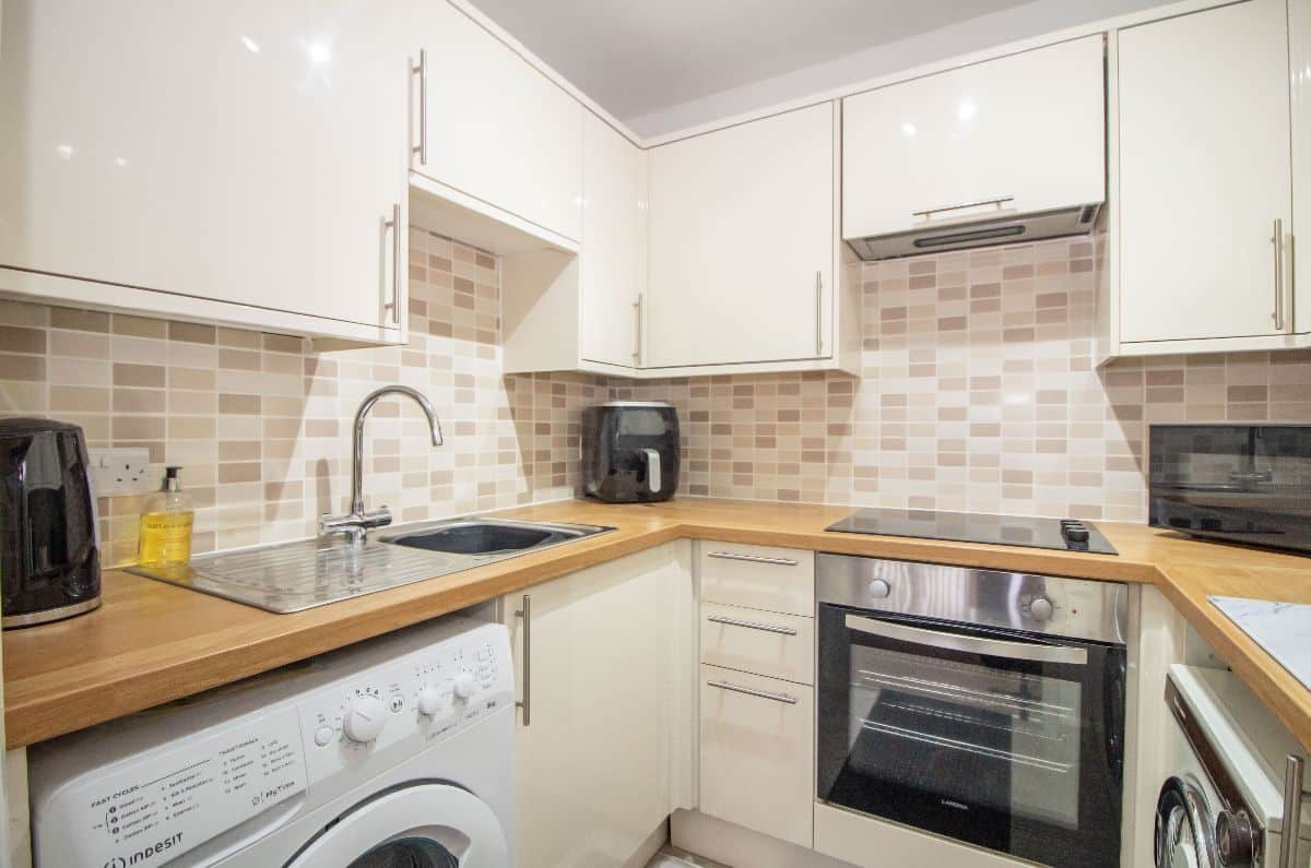 Modern matching range of wall and base units complemented with work surfaces over incorporating stainless steel sink unit with mixer tap and drainer, electric hob with extractor canopy over and electric oven below, washing machine (to remain, fitted 2025) , integrated under counter fridge, tiled splashback, smoothed ceiling with extractor fan.