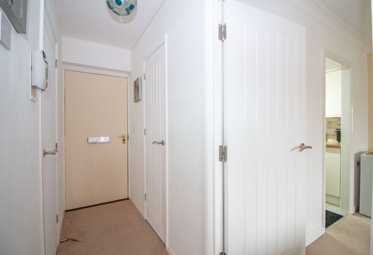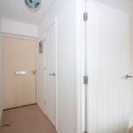 Smoothed ceiling, wall mounted security intercom and emergency alarm pull cord, storage cupboard with shelving and housing wall mounted electrical fuse board.