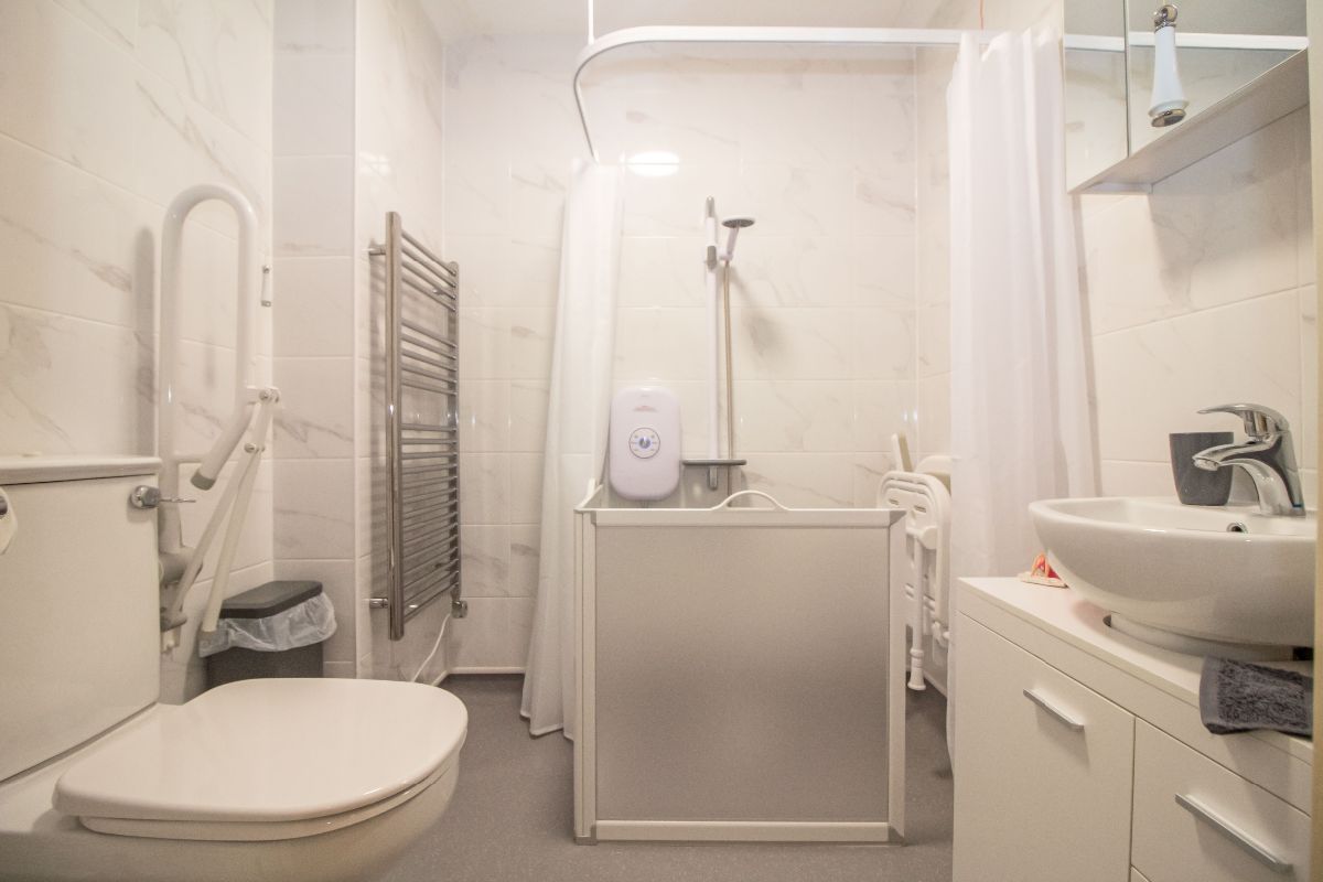 Modern refitted suite comprising shower area with wall mounted shower, wall mounted fold away seat with drainage area, wash hand basin set in vanity unit, close coupled low level wc, wall mounted 'Dimplex' warm air heater, chromium ladder style heated towel rail, wall mounted grab rails, tiled to principle areas, coved and textured ceiling.