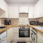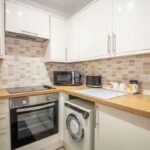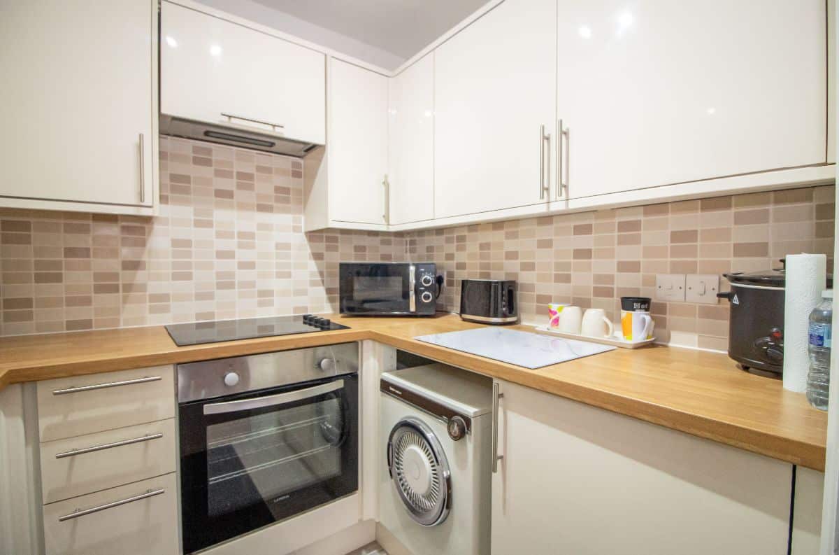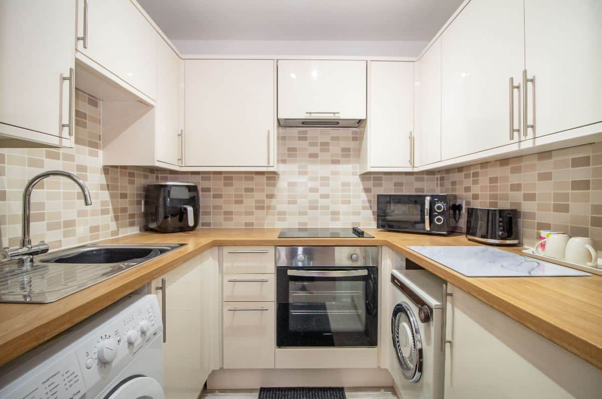 Modern matching range of wall and base units complemented with work surfaces over incorporating stainless steel sink unit with mixer tap and drainer, electric hob with extractor canopy over and electric oven below, washing machine (to remain, fitted 2025) , integrated under counter fridge, tiled splashback, smoothed ceiling with extractor fan.