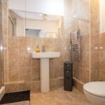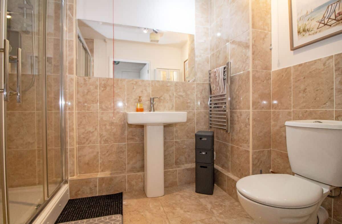 Modern suite comprising walk in shower cubicle with wall mounted shower and grab rail, pedestal wash hand basin, close coupled low level wc, chromium ladder style heated towel rail, emergency alarm pull cord, smoothed ceiling with extractor fan and access to loft area, tiled flooring and to principle areas.