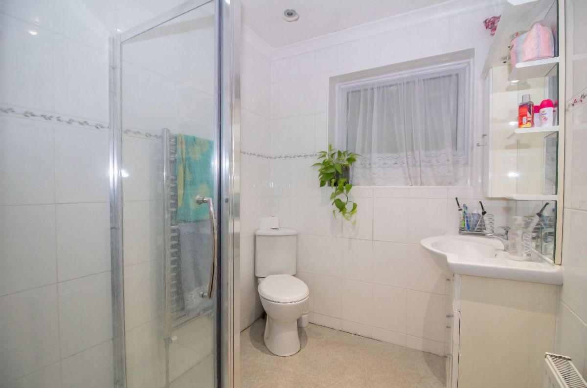 Suite comprising shower cubicle with wall mounted shower, corner low level wc, wash hand basin set in vanity unit, fully tiled walls, double glazed obscured window to rear aspect, coved and smoothed ceiling with access to loft area (where boiler housed), radiator.