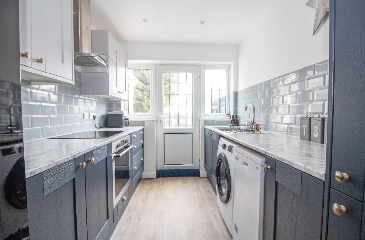 Modern matching range of wall and base units complemented with work surfaces over incorporating stainless steel sink unit with mixer tap and drainer, electric hob with extractor canopy over, electric oven below, space for freestanding fridge / freezer, space and plumbing for washing machine, larder style cupboard housing wall mounted Vaillant boiler for central heating, tiled to principle areas, double glazed lead light effect door and double glazed lead light effect window to rear aspect, smoothed ceiling with pin spot downlighting.