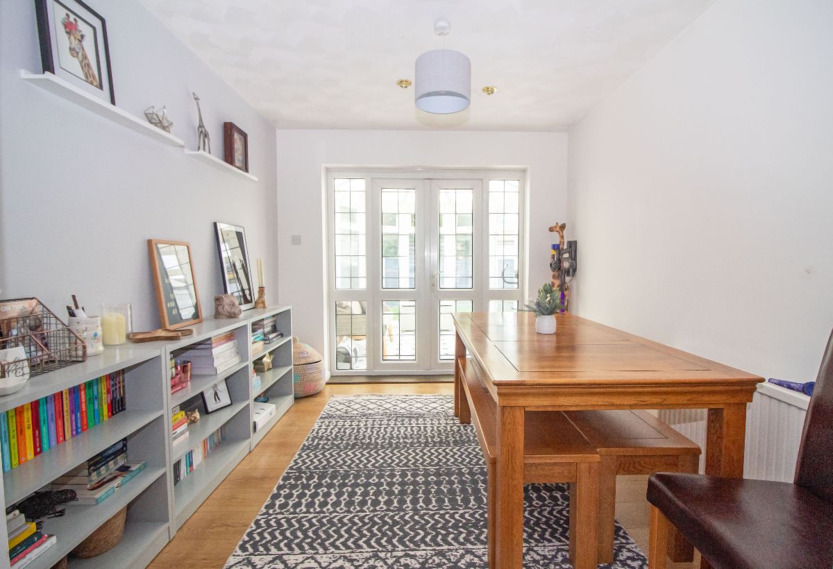 Laminate wood effect flooring, radiator, textured ceiling with pin spot downlighting, double glazed lead light effect french doors and double glazed lead light effect side panels to rear aspect / conservatory.