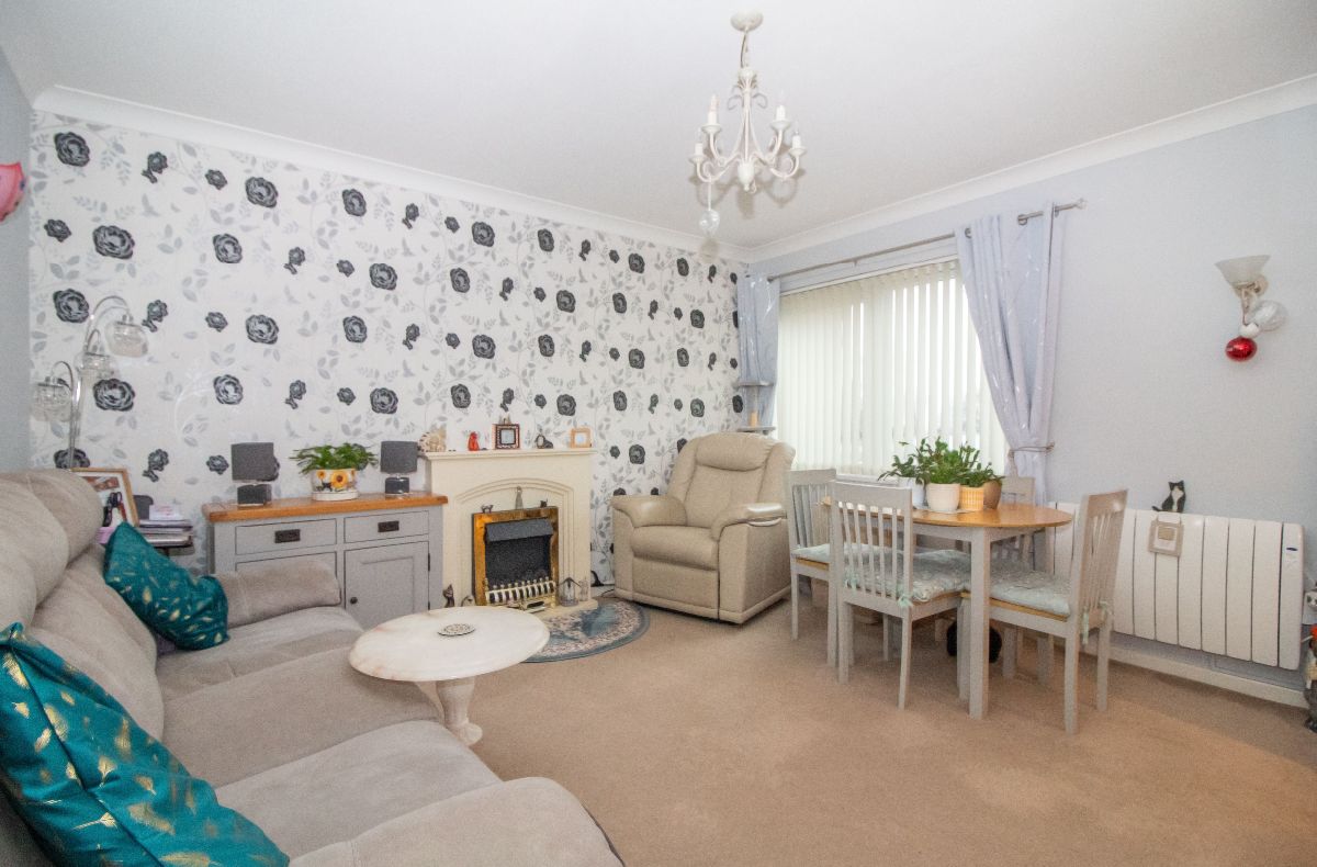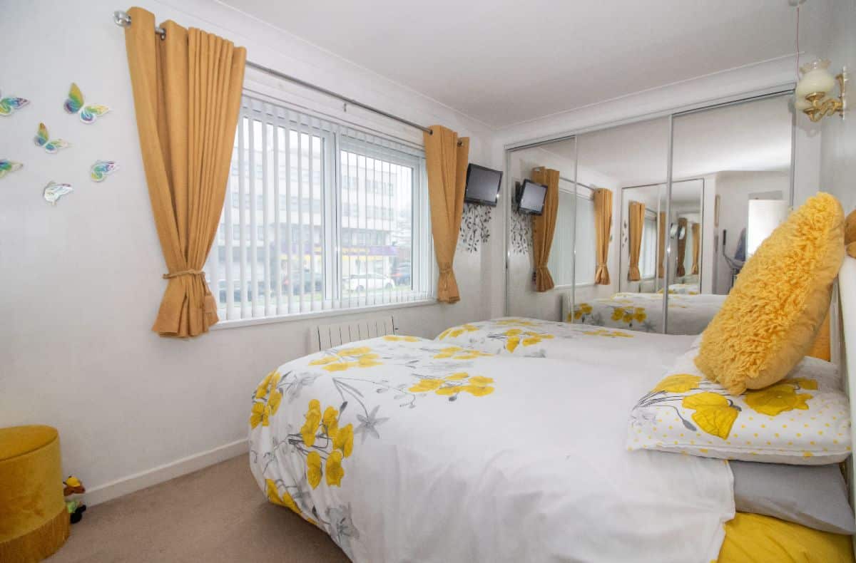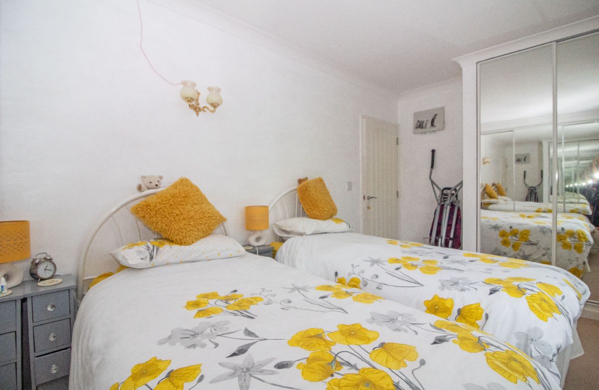 Two sets of mirror fronted fitted wardrobe cupboards. Double glazed window to front aspect, wall mounted electric heater, emergency alarm pull cord, coved and textured ceiling.