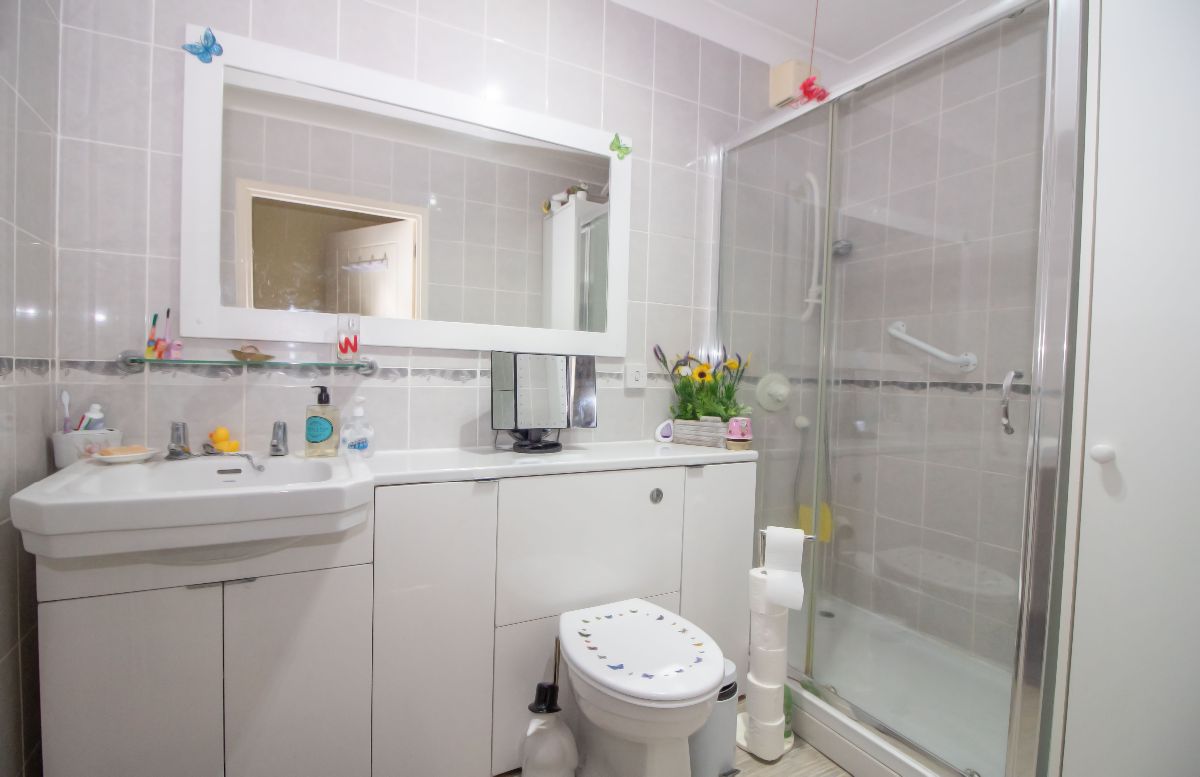 Modern suite comprising walk in shower cubicle, wash hand basin and low level wc set in vanity unit, tiled walls and flooring, coved and textured ceiling, emergency alarm pull cord, wall mounted extractor fan, wall mounted electric heater.