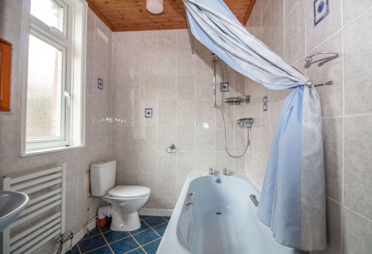 Suite comprising panelled bath, pedestal wash hand basin, close coupled low level wc, tiled walls, ladder style radiator, double glazed obscured window to side aspect, wall mounted light / shaver point, airing cupboard with shelving and hot water tank.