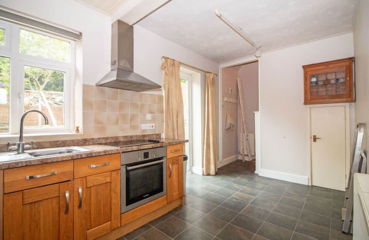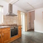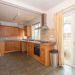 (Maximum measurements not including depth of staircase to first floor). Matching range of wall and base units complemented with work surface over incorporating stainless steel sink unit with mixer tap and drainer, electric hob with stainless steel extractor canopy over and electric oven below, space and plumbing for washing machine, tiled splashback, laminate tiled effect flooring, two double glazed windows to rear aspect, double glazed French doors to rear aspect, two radiators, understairs storage cupboard.