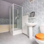 Four piece suite comprising panelled bath, separate shower cubicle, pedestal wash hand basin, close coupled low level wc, tiled walls, velux style window to rear aspect, access to eaves storage housing wall mounted boiler for central heating, chromium ladder style radiator.