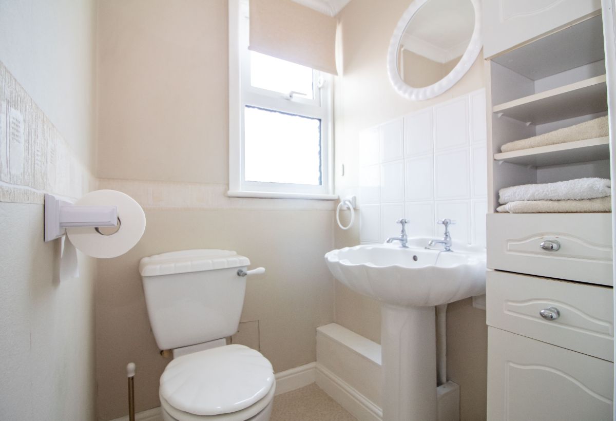 Close coupled low level wc, pedestal wash hand basin, double glazed obscured window to side aspect, tiled to principle areas, coved and textured ceiling.