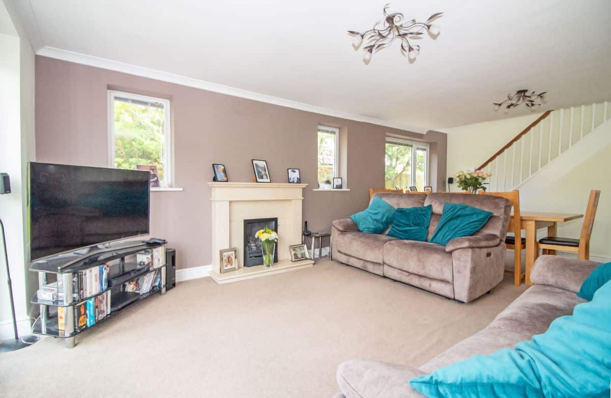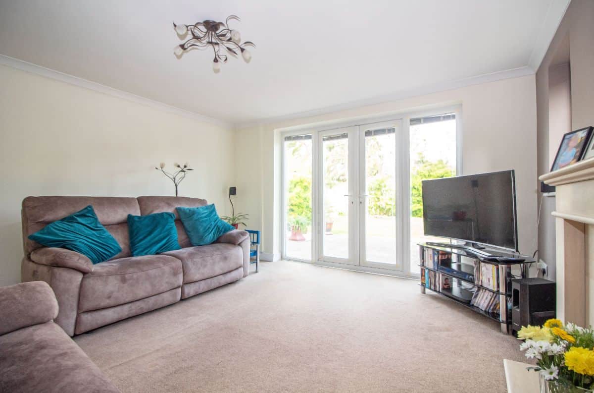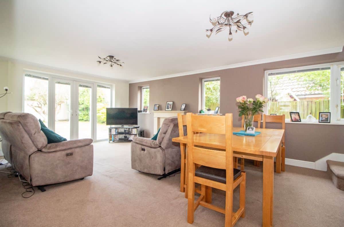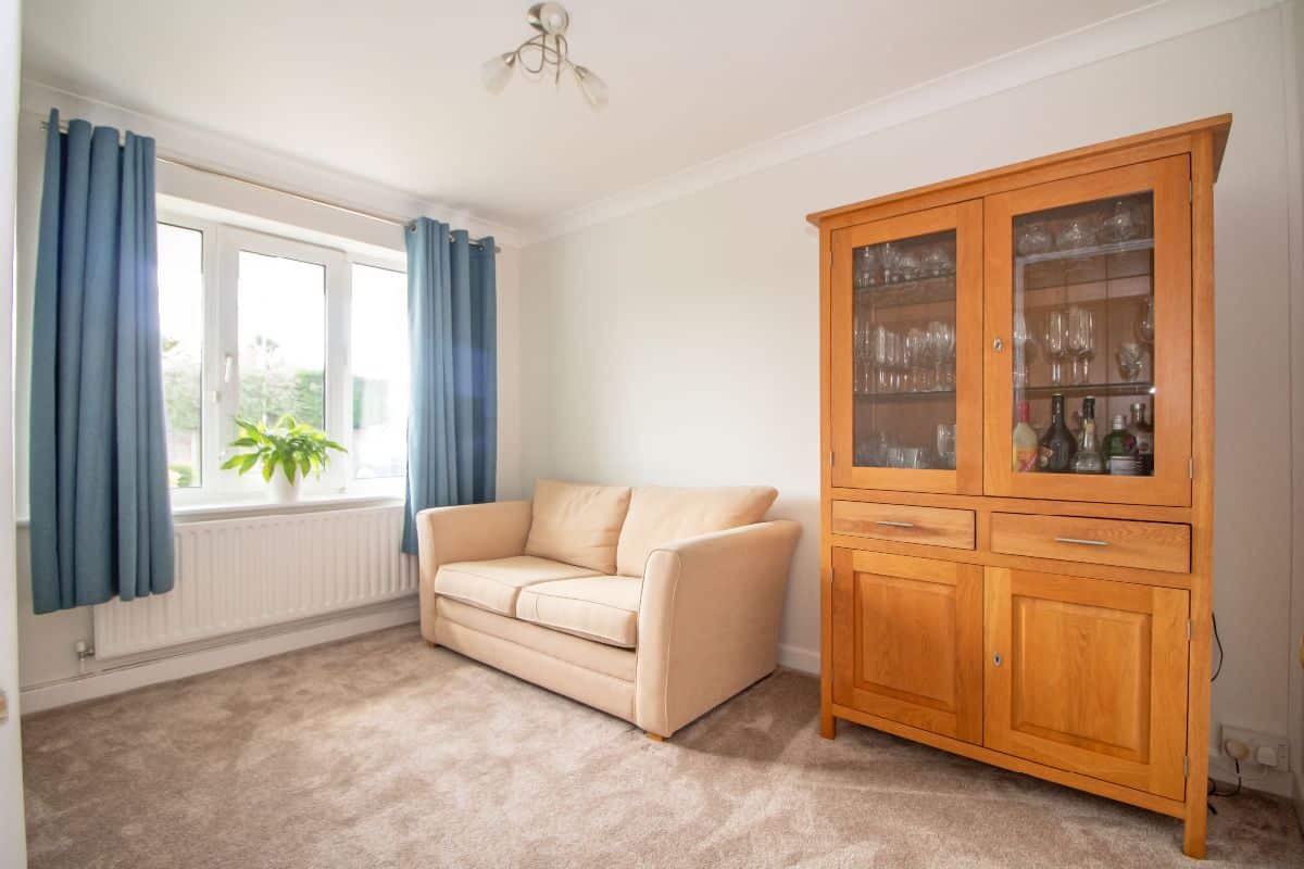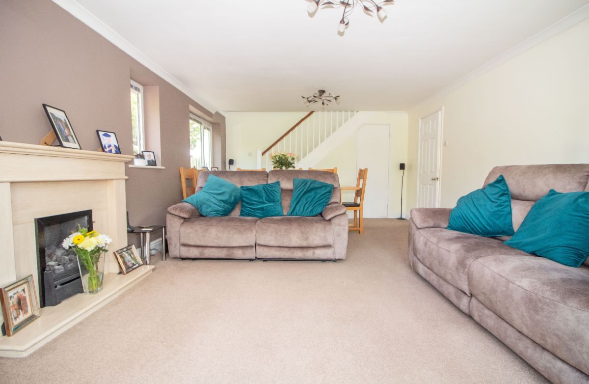 Double glazed double doors with double glazed side panels leading out to rear garden, feature fireplace with gas living flame effect fire, three double glazed windows to side aspect, stairs to the first floor with understairs storage cupboard, coved and smoothed ceiling, radiator.