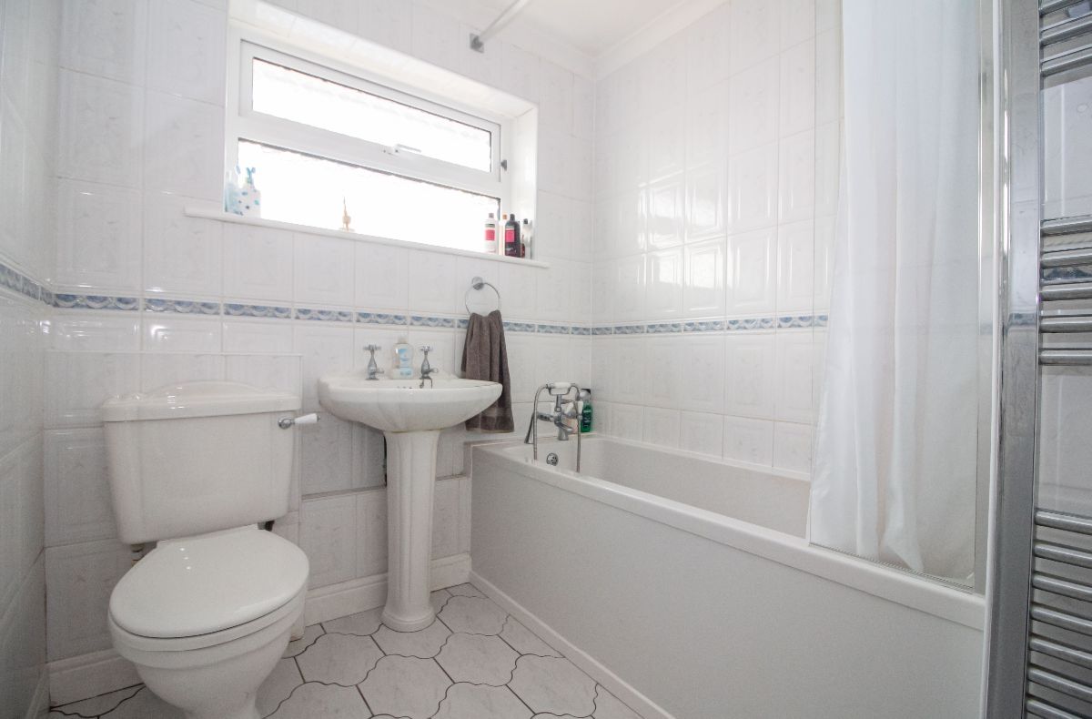 Suite comprising panelled bath with wall mounted shower and shower screen, pedestal wash hand basin, close coupled low level wc, chromium ladder style radiator, tiled flooring and principle areas, double glazed obscured window to side aspect, coved and textured ceiling.