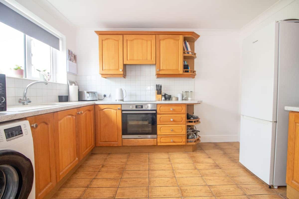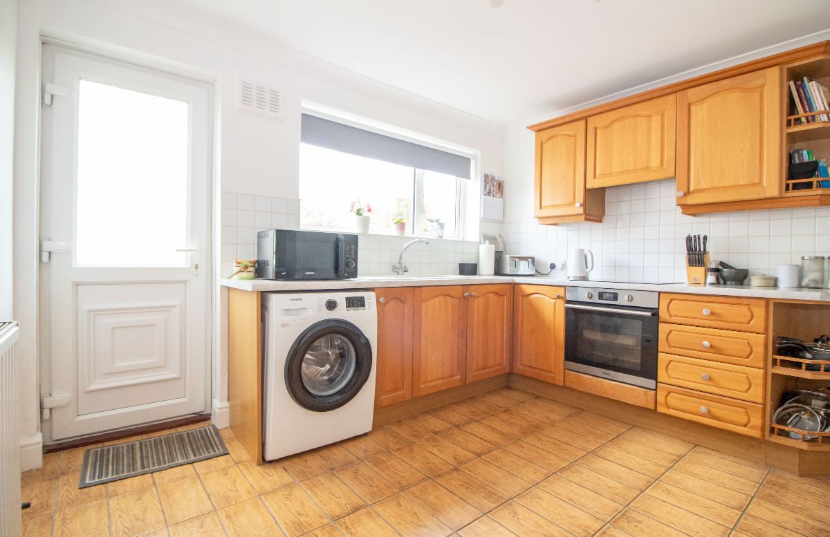 Matching range of wall and base units complemented with work surface over incorporating 1½ bowl sink unit with mixer tap and drainer, electric hob with extractor canopy over and electric oven below, space and plumbing for washing machine, space for fridge / freezer, wall mounted Vaillant boiler for central heating and domestic hot water, double glazed window and door to rear aspect overlooking rear garden, tiled flooring and principle areas, coved and smoothed ceiling.