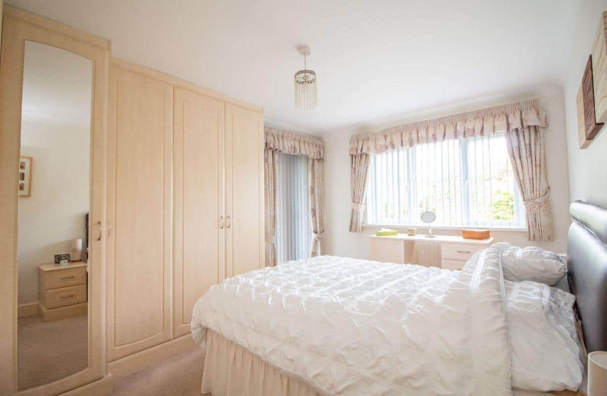 Double glazed window to front aspect, double glazed double doors to side aspect, fitted wardrobe cupboards, radiator, coved and smoothed ceiling.