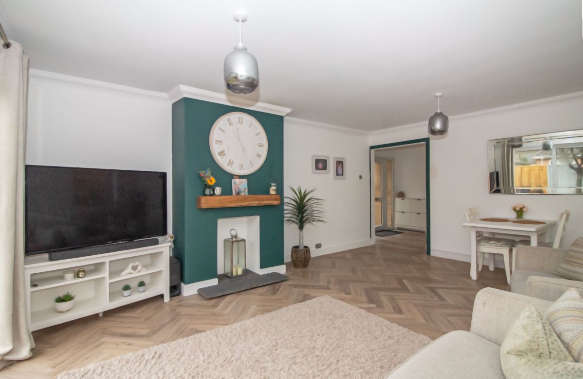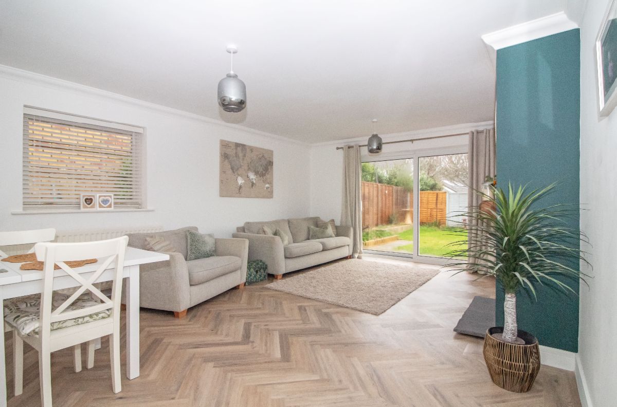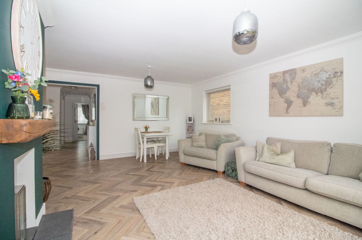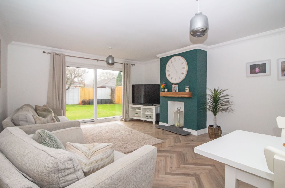 Feature fireplace with wood mantle and tiled hearth, double glazed sliding patio door to rear aspect and garden, coved and smoothed ceiling, double glazed window to side aspect, radiator, laminate wood effect flooring.
