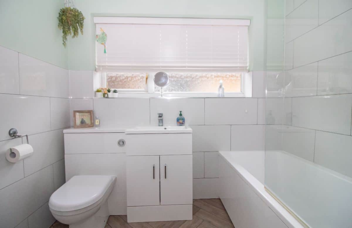 Modern white suite comprising panelled bath with wall mounted shower over and shower screen, low level wc and wash hand basin set in vanity unit, double glazed obscured window to side aspect, laminate wood effect flooring, chromium ladder style radiator, smoothed ceiling with extractor fan.