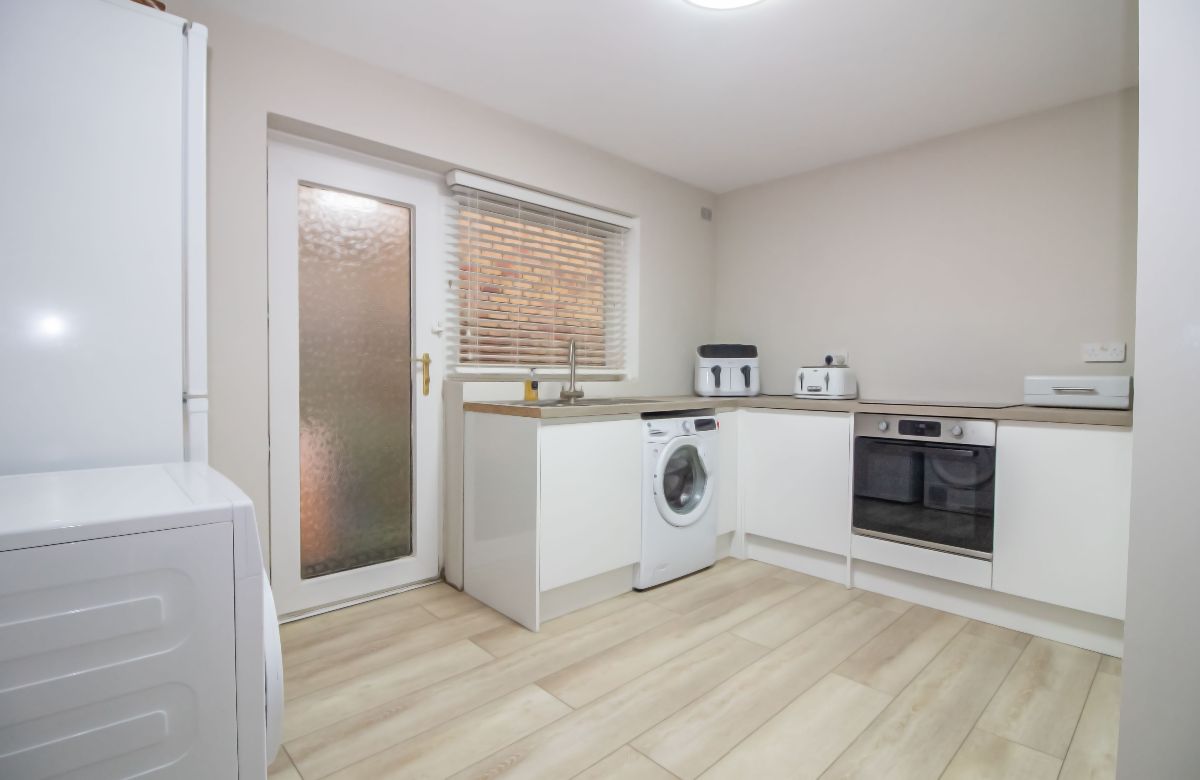 Modern refitted kitchen boasting matching units complemented with work surfaces over incorporating stainless steel sink unit with mixer tap and drainer, electric hob with oven below, space and plumbing for washing machine, double glazed window and door to side aspect, smoothed ceiling, laminate wood effect flooring.