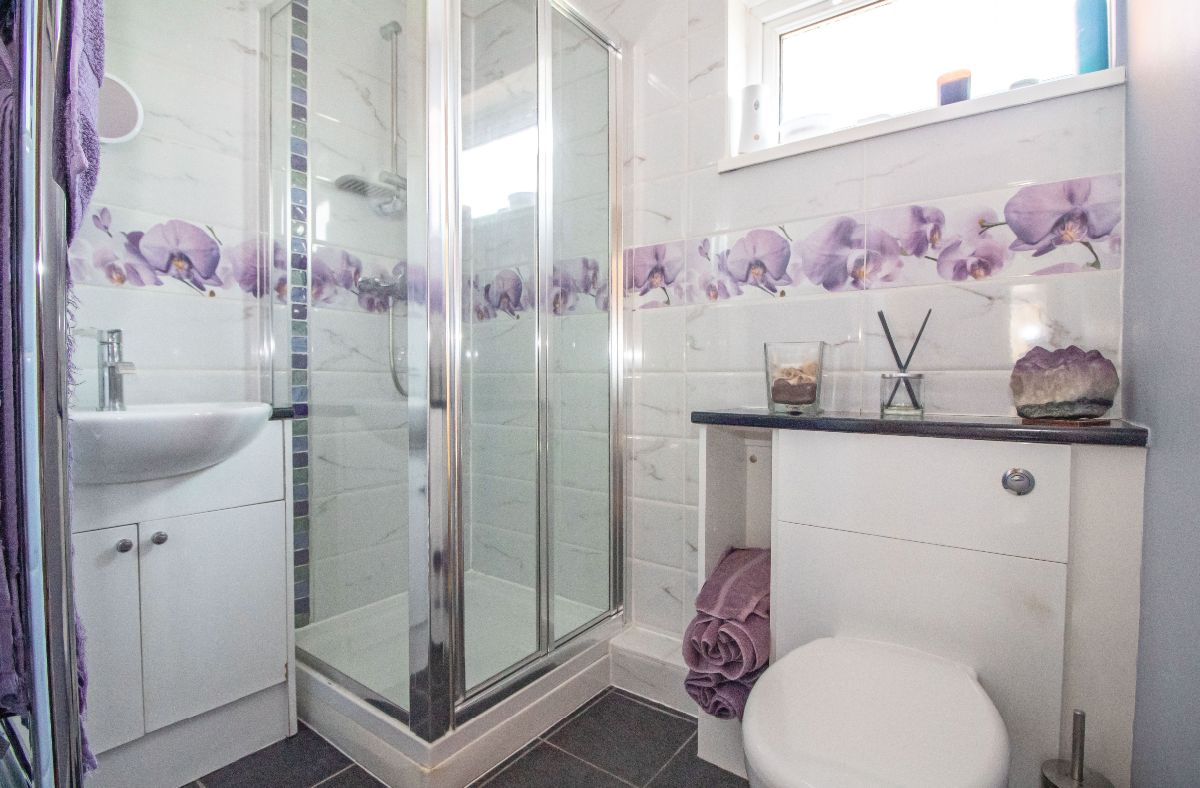 Modern refitted suite comprising shower cubicle with wall mounted shower, wash hand basin and low level wc set in vanity units, chromium ladder style radiator, tiled to principle areas, double glazed obscured window to rear aspect, smoothed ceiling.