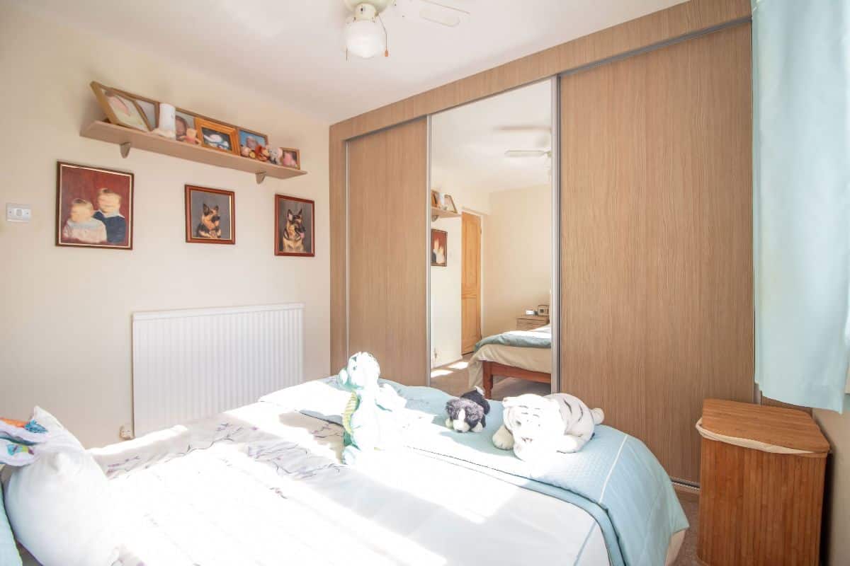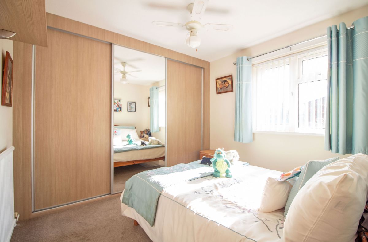 Floor to ceiling fitted full width fitted wardrobe cupboards, double glazed window to side aspect, radiator.