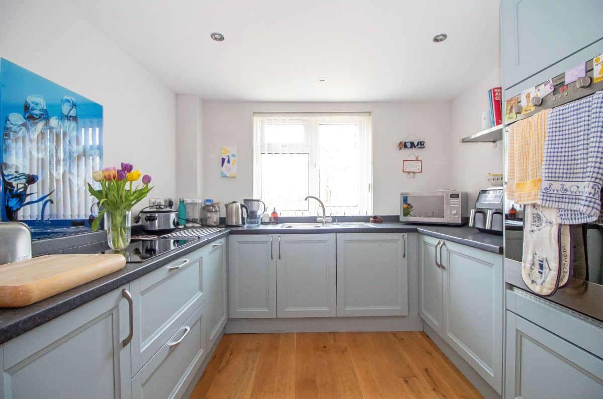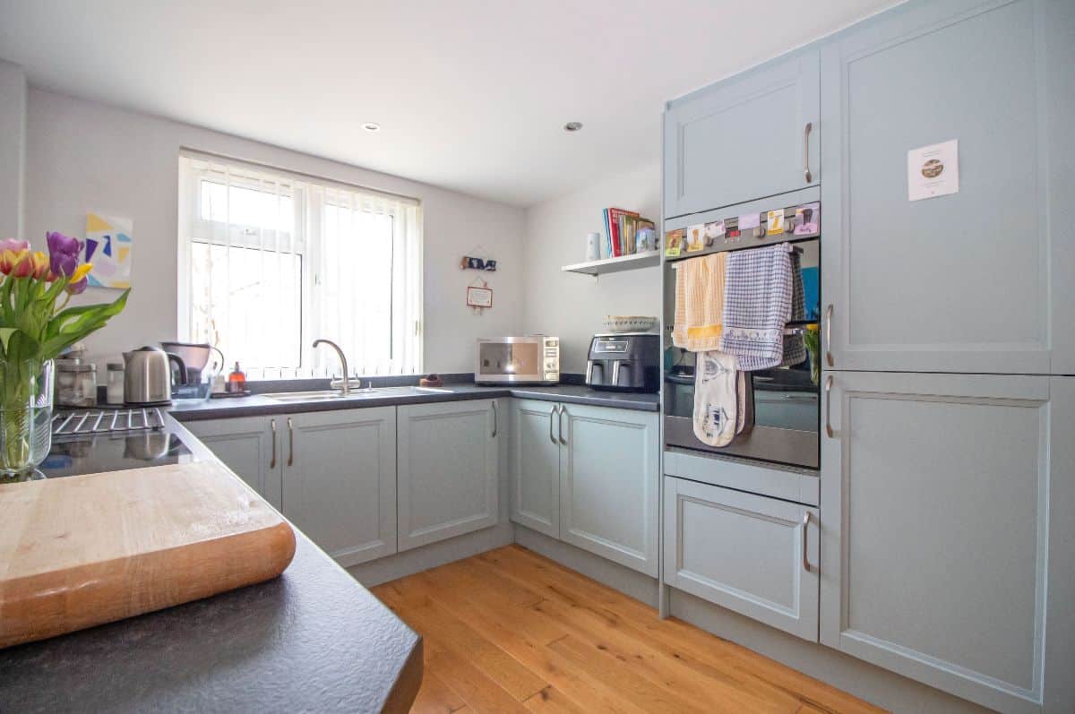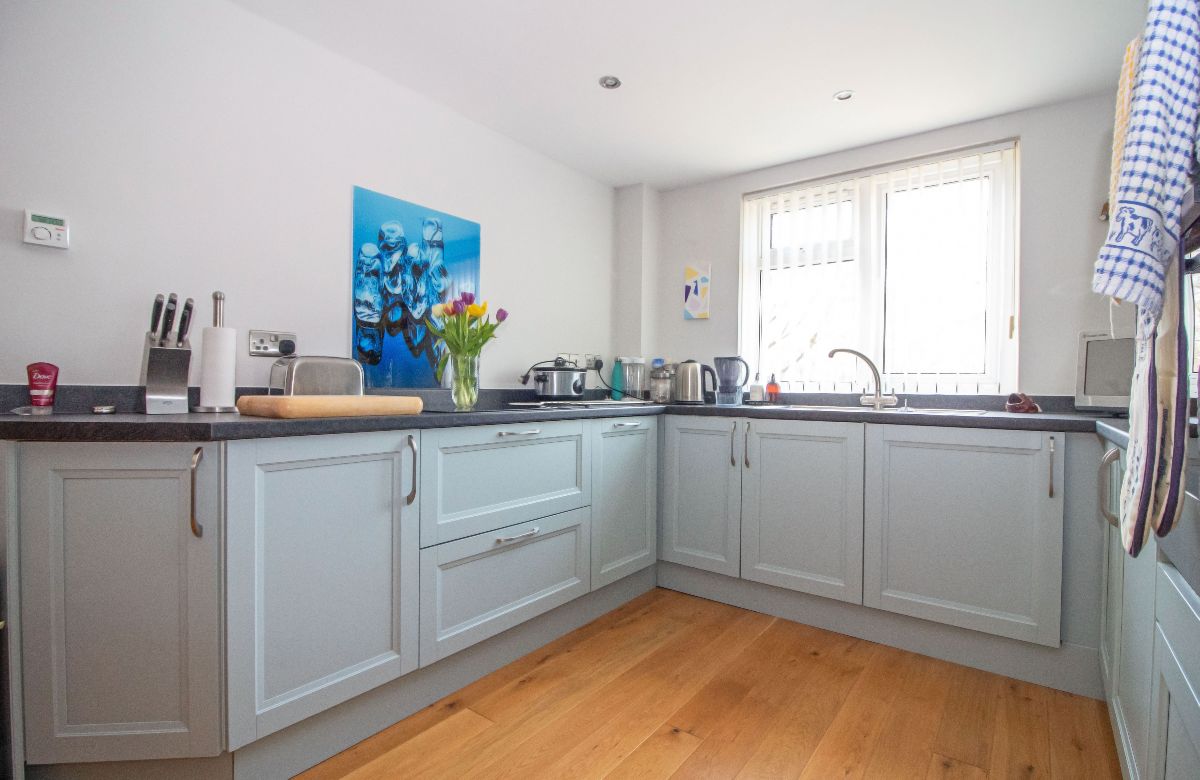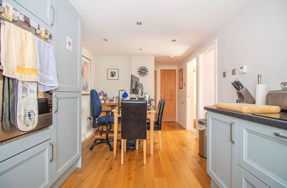 Modern matching range of wall and base units complemented with work surfaces over incorporating stainless steel sink unit with mixer tap and drainer, electric hob with glass splashback, stainless steel eye level double oven, integrated appliances to include fridge / freezer, washing machine and dishwasher, space for tumble dryer, wall mounted designer vertical radiator, space for dining table and chairs, walk in storage cupboard with shelving housing wall mounted 'Alpha' combination boiler for central heating and domestic hot water, double glazed window to front aspect, wood flooring, smoothed ceiling with pin spot downlighting.