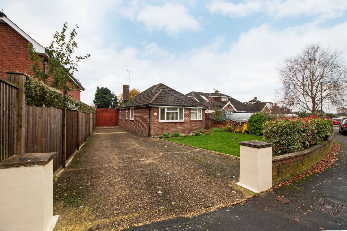 The bungalow occupies a corner plot, which gives an especially wide frontage and a driveway which can accommodate several vehicles. It would be suitable for somebody needing space for a large van or motorhome. There is a gated car port, and also a large, detached garage with a separate workshop area. The rear garden measures approximately 60ft, has a large patio, and benefits from a southerly aspect.