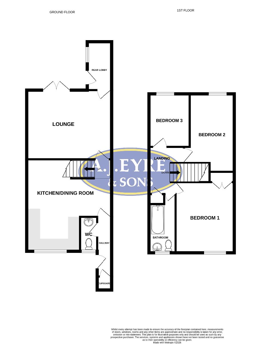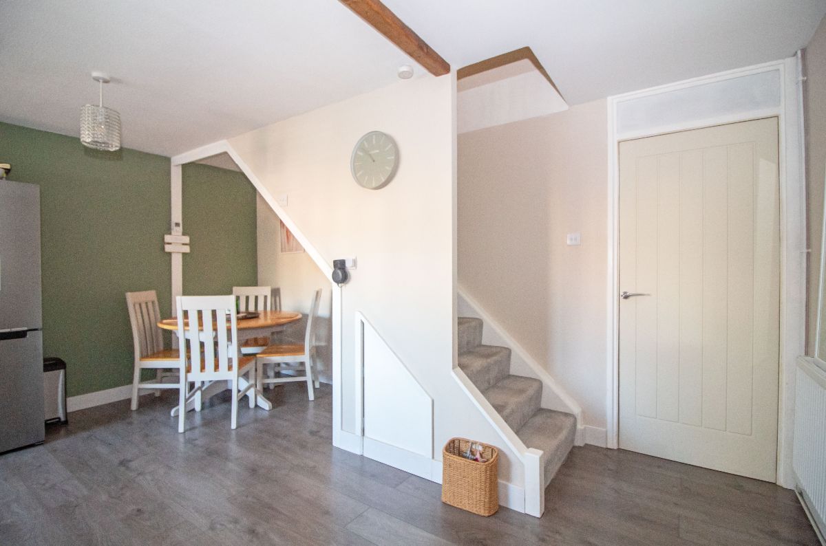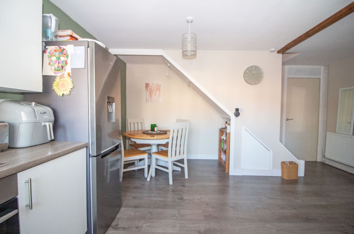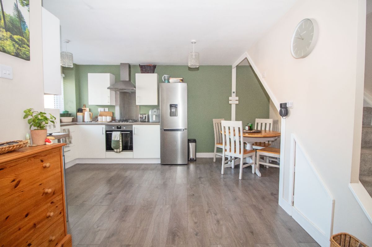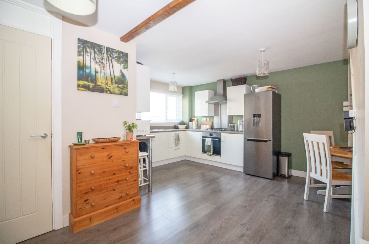 Maximum measurements. Modern refitted matching range of wall and base units complemented with work surfaces over incorporating 1½ bowl stainless steel sink unit with mixer tap and drainer, stainless steel four ring gas hob with stainless steel extractor canopy over and stainless steel electric oven below, space and plumbing for washing machine, space for fridge / freezer, space for table and chairs, wall mounted 'Ideal Atlantic' boiler for central heating and domestic hot water, double glazed window to front aspect, laminate wood effect flooring, two radiators, stairs to the first floor with understairs storage cupboard, door to lounge.