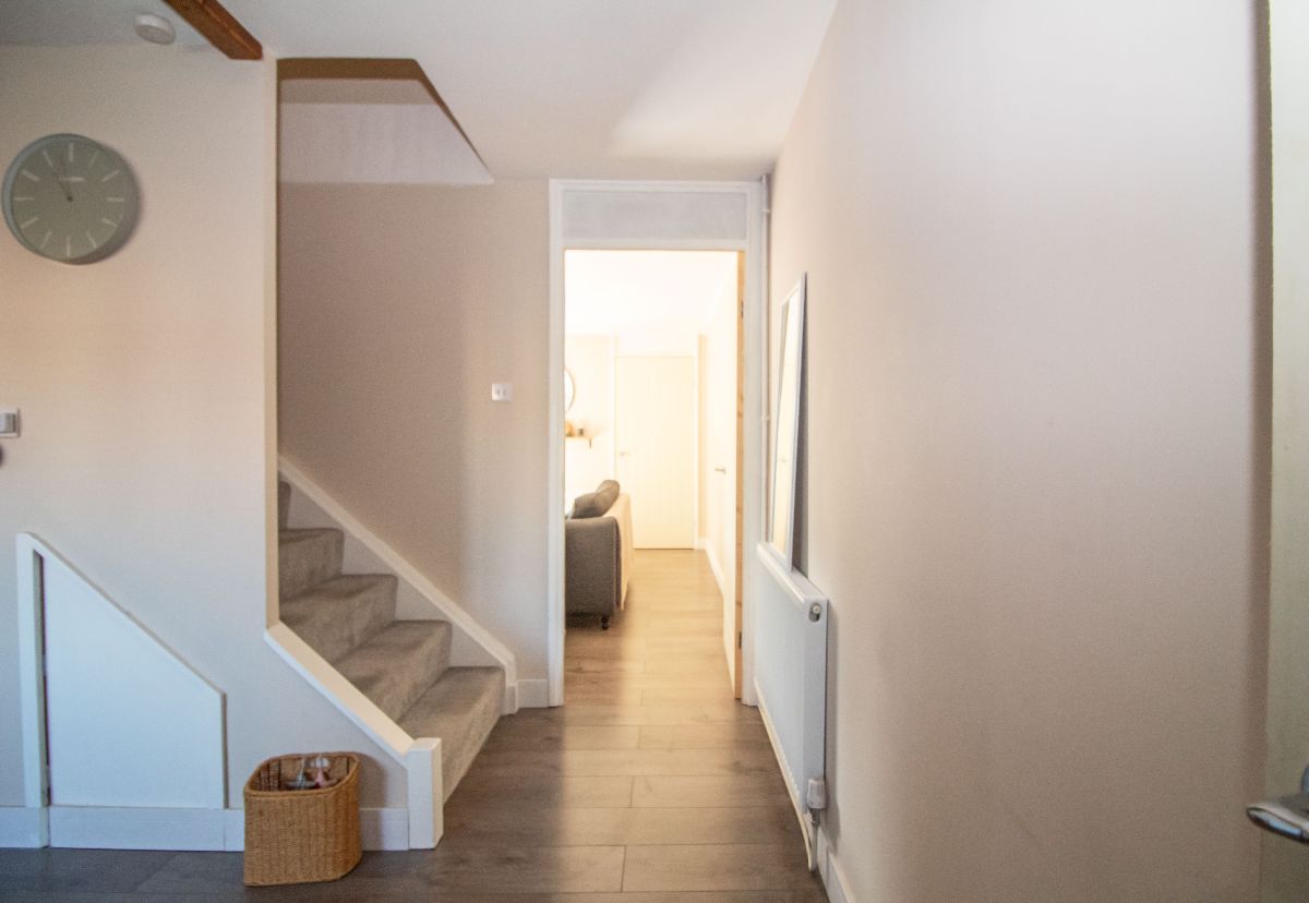 Laminate wood effect flooring, smoothed ceiling, storage cupboard housing utility meters.