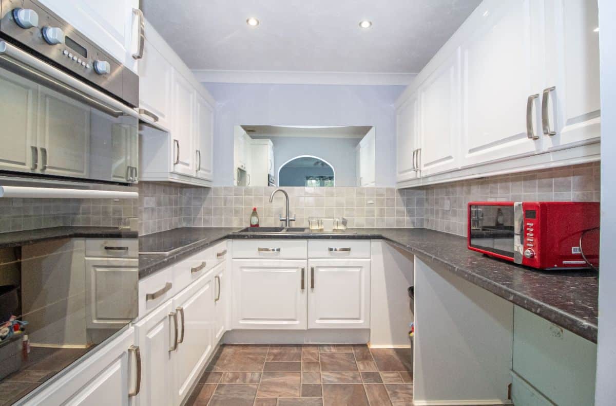 Modern matching range of wall and base units complemented with work surfaces over incorporating 1½ bowl sink unit with mixer tap and drainer, four ring electric hob with extractor canopy over, stainless steel eye level double oven, space and plumbing for washing machine, spaces for under counter fridge and freezer, tiled splashback, laminate tiled effect flooring, coved and textured ceiling with pin spot downlighting.