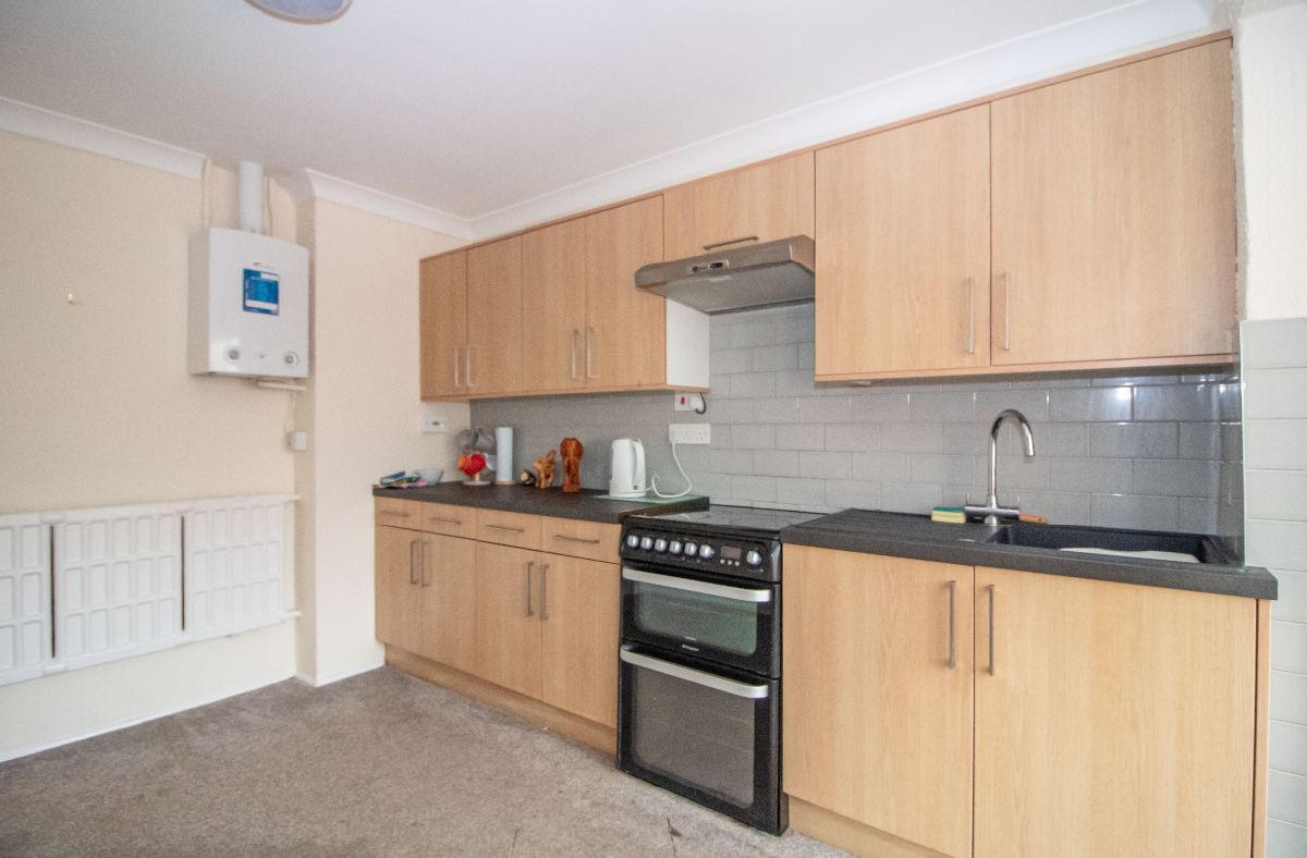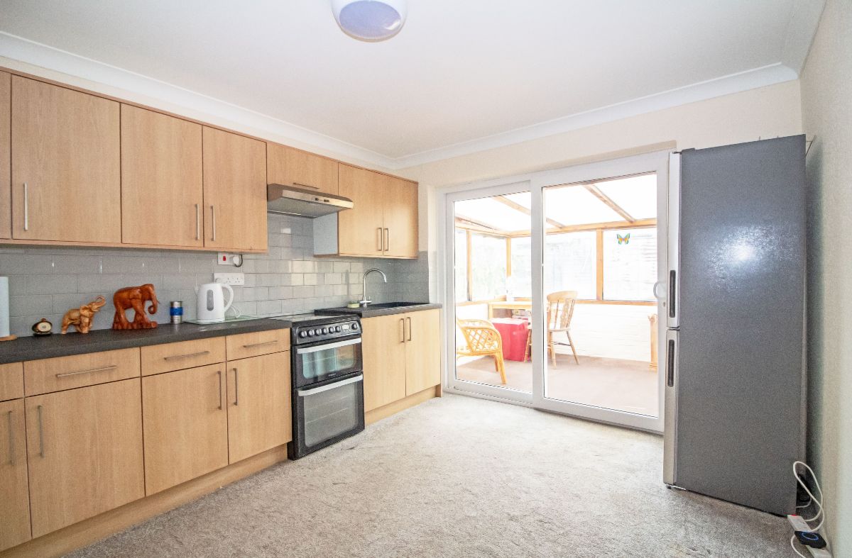 Matching range of wall and base units complemented with work surfaces over incorporating sink unit with mixer tap and drainer, space for cooker with extractor canopy over, wall mounted Worcester boiler for central heating, tiled to principle areas, radiator, coved and smoothed ceiling, sliding patio doors to lean to.