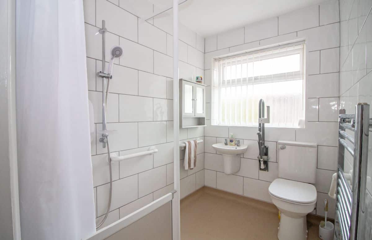 Wall mounted shower and wall mounted foldaway seat with drainage area, wall mounted grab rail, wash hand basin, close coupled low level wc, tiling to walls, double glazed obscured window to rear aspect, smoothed ceiling with access into loft area, chromium ladder style radiator.