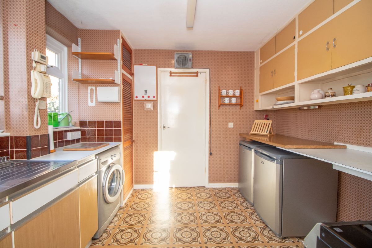 Matching range of wall and base units complemented with work surfaces over incorporating stainless steel sink unit with mixer tap and drainer, space for freestanding cooker, space and plumbing for washing machine, space for under counter fridge and freezer, fitted larder style cupboard, two double glazed windows to rear aspect overlooking the rear garden, double glazed door to side aspect and garden, tiled to principle areas.
